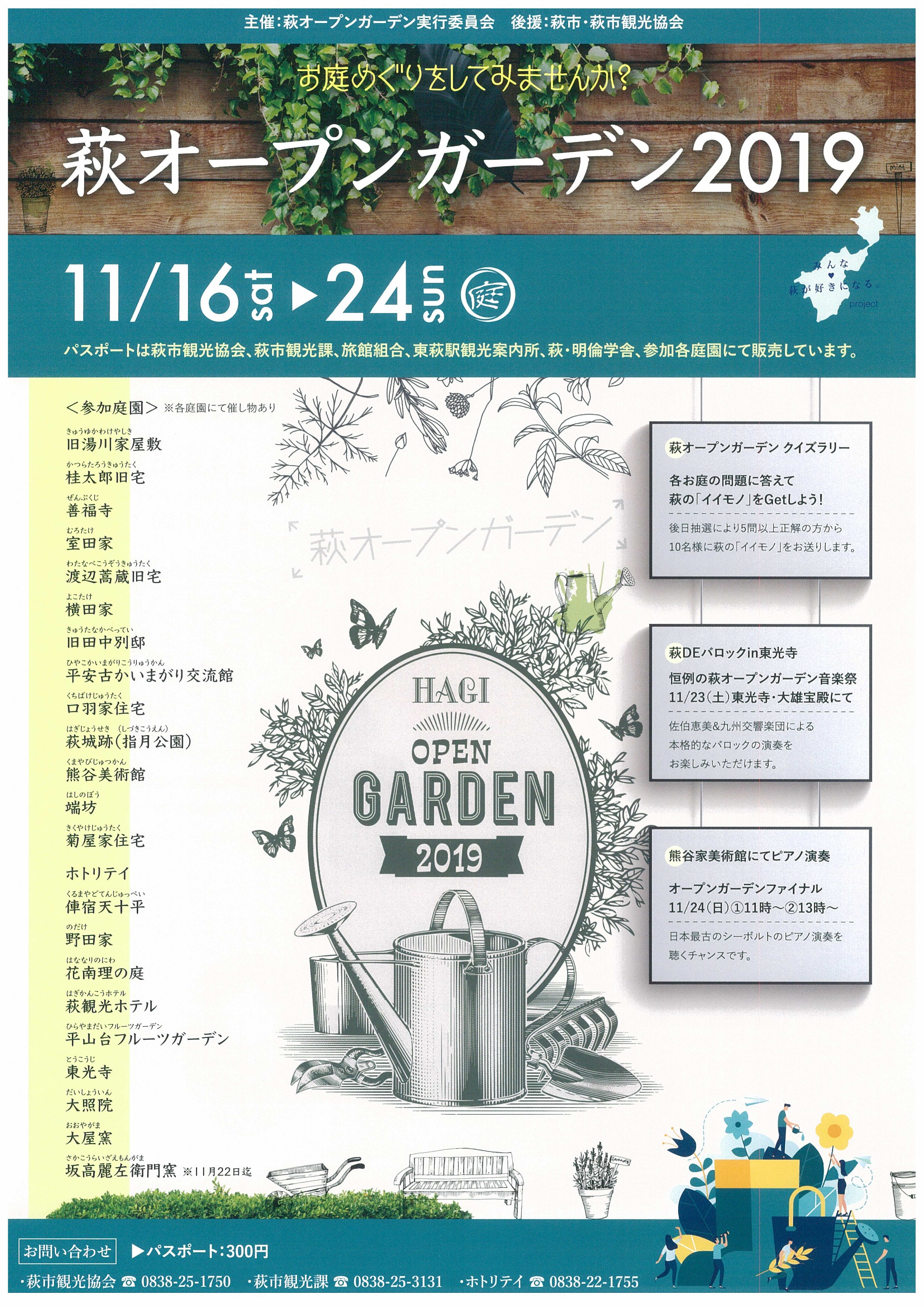 参加各庭園、萩市観光協会、萩市観光課、萩温泉旅館協同組合、東萩駅観光案内所、萩・明倫学舎等