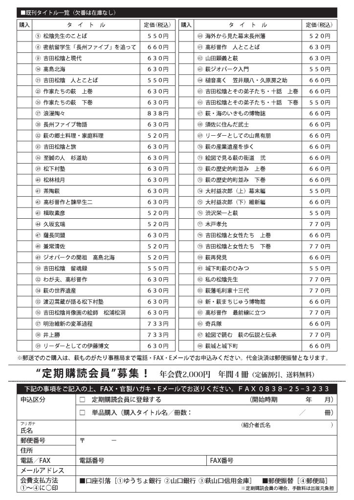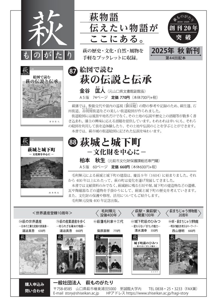 一般社団法人萩ものがたりでは、ブックレットシリーズ「萩ものがたり」を定期的(春・秋年4冊)に出版しています(2004年創刊)。