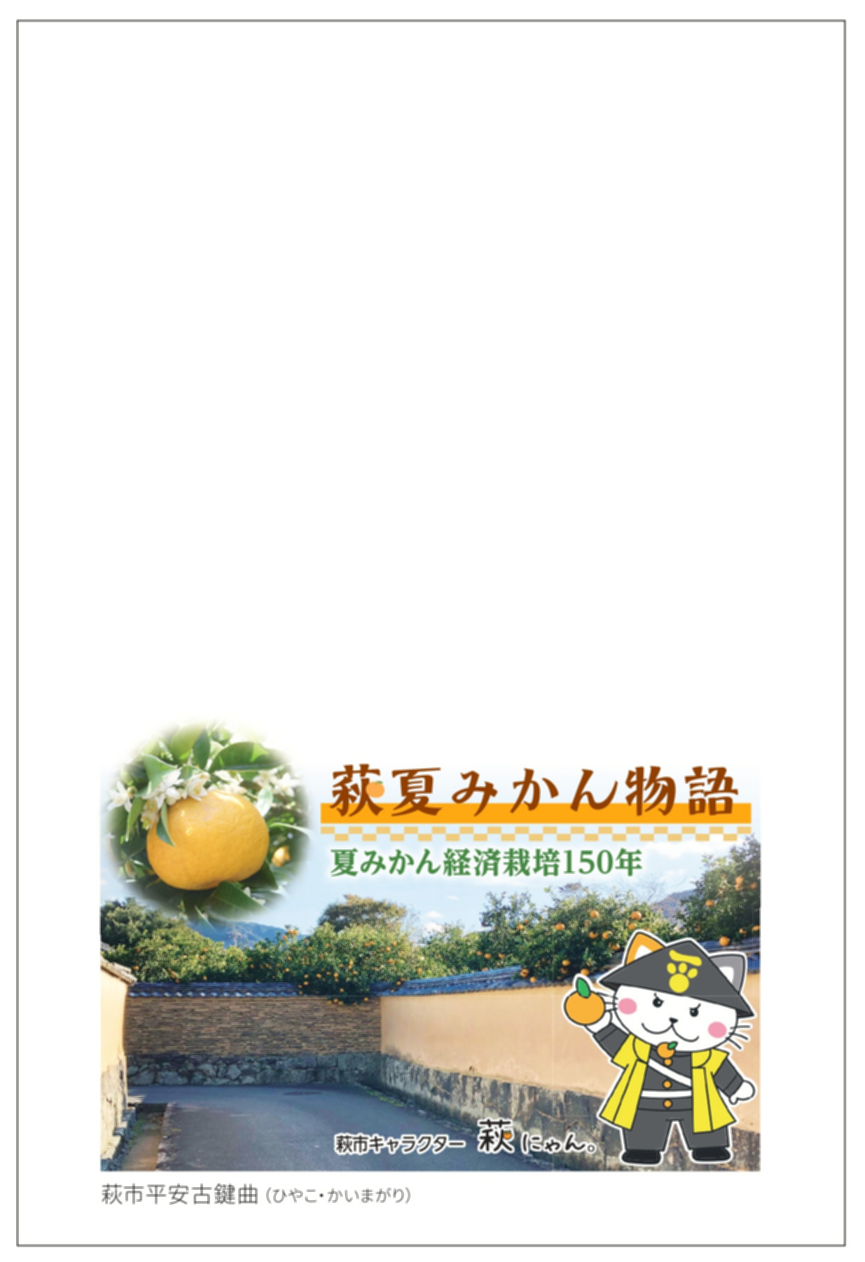 今年は、来年迎える夏みかんの経済栽培150年を記念し、土塀から黄色くたわわに実った夏みかんがのぞく、萩ならではの風景が残る「平安古鍵曲(ひやこかいまがり)」と萩にゃん。をデザインしました。