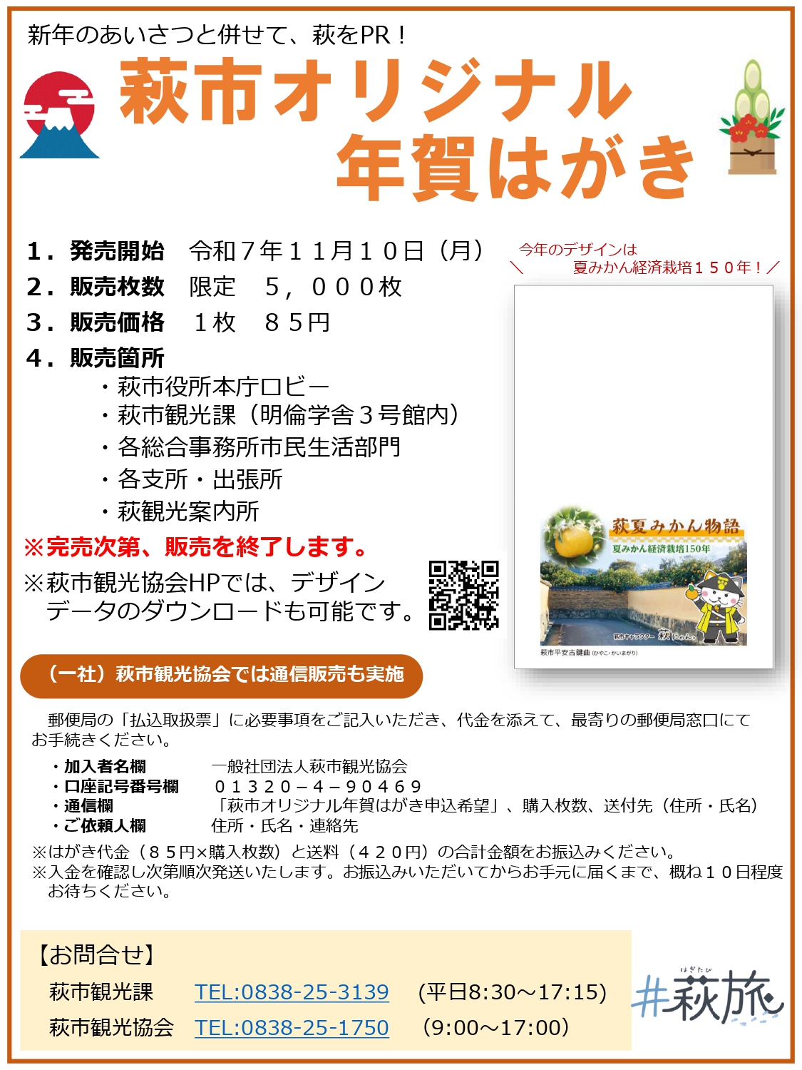 萩市観光課 電話 0838-25-3139(平日 8:30~17:15)