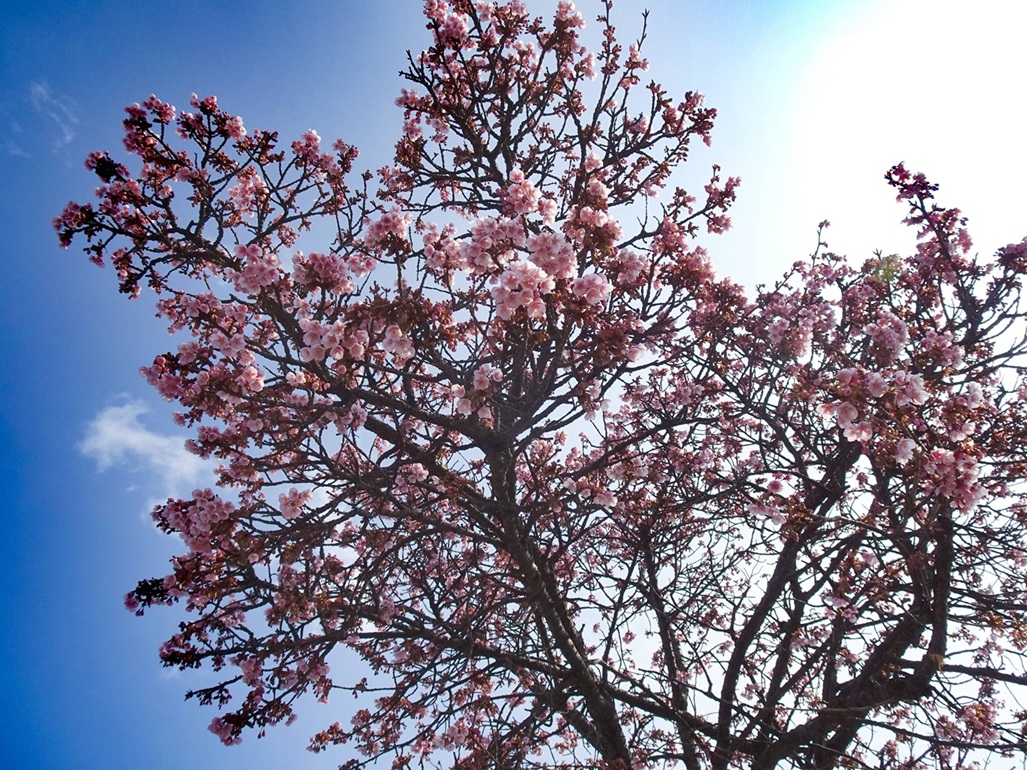 つぼみは薄い紅色で、開花すると花びらの中心部のやや濃いピンク色が外に向かって淡い色となります。ソメイヨシノよりも色が濃く、下向きに咲きます。