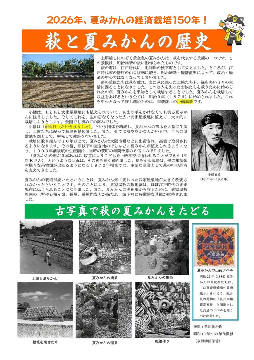 夏みかんのルーツは、長門市青海島の「大日比のナツミカン原樹」から始まります。市民の方から寄付されたこの夏みかんは、藩政時代に大日比から萩に持ち込まれた当時の夏みかんが成長した姿と考えられます。