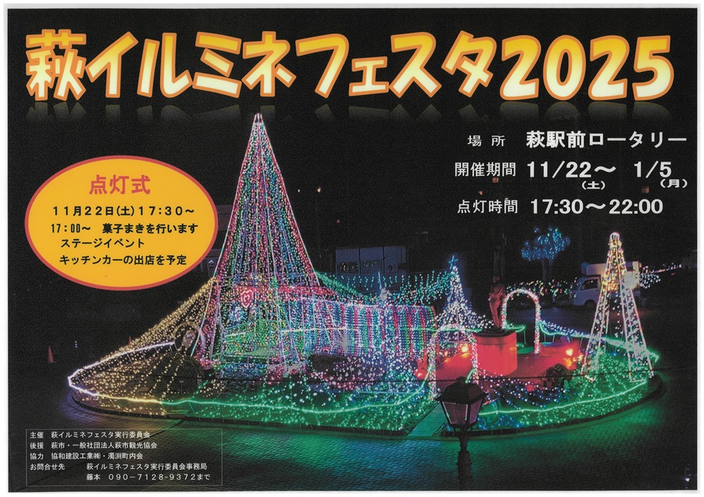 お問合せ | 萩イルミネフェスタ実行委員会事務局(藤本) 電話090-7128-9372 |